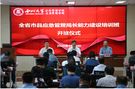 20209月14日上午,我院与陕西省应急管理厅举办的“全省市县应急管理局长能力建设培训班”在我院多媒体会议室举行开班仪式。陕西省应急管理厅党委委员、副厅长李进同志,西北大学党委常委、副校长王正斌教授,我院院长雷晓康教授出席开班仪式。来自全省市县七十余名应急管理局长参加了开班仪式。