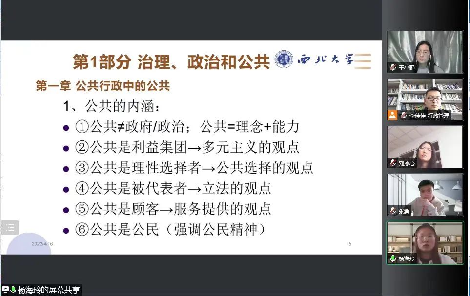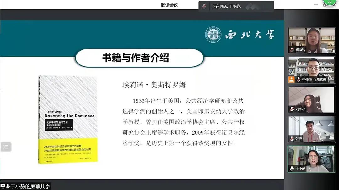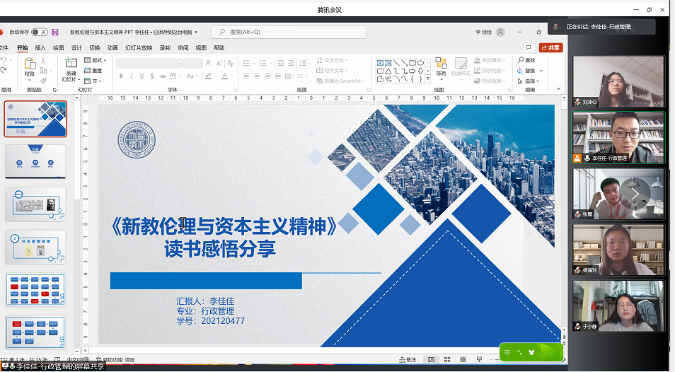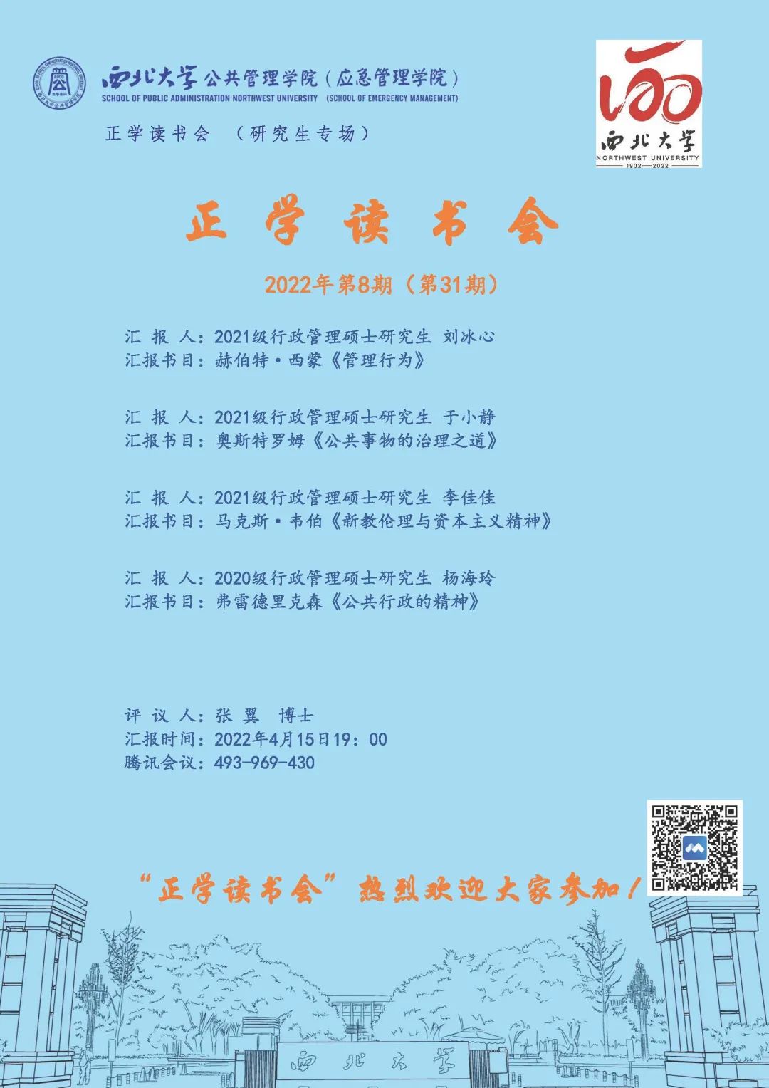 2022年4月15日下午,我院举办了本学期第8期研究生读书分享会。2021级行政管理专业研究刘冰心、于小静、李佳佳,2020级行政管理专业研究生杨海玲进行了分享,张翼博士担任评议人。