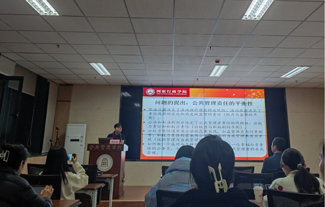 胡仙芝研究员首先由公共管理责任的平衡性引出本次主题,指出依法治国决定了法治政府建设的必然性,而法治政府决定了责任政府的定位和高度,以及被监督的责任。公法和私法的划分决定了公共管理者责任的两维性,包括公权力责任和私权力责任。接着,进一步强调了做一个成功而合格的公共管理者重要性,并结合平衡理论探讨了公共管理者的自我管理。
