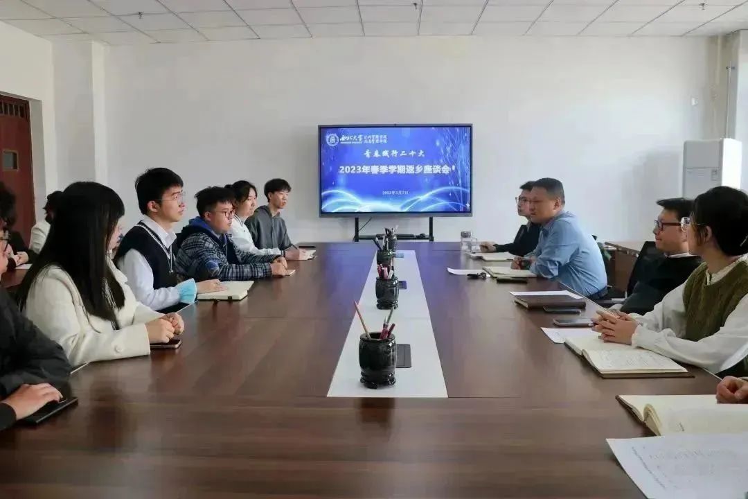 2023年3月7日下午,西北大学565net必赢组织召开2023年春季学生返乡座谈会。学院党委副书记韩杰老师、2019级本科生辅导员陈露老师、2020级本科生辅导员杨嘉仪老师、研究生辅导员苏林老师、2021级本科生辅导员杨琬钰老师、2022级本科生辅导员王晶玉老师以及来自学院各年级的14位本科生、研究生代表参加了此次座谈会。本次座谈由韩杰老师主持。