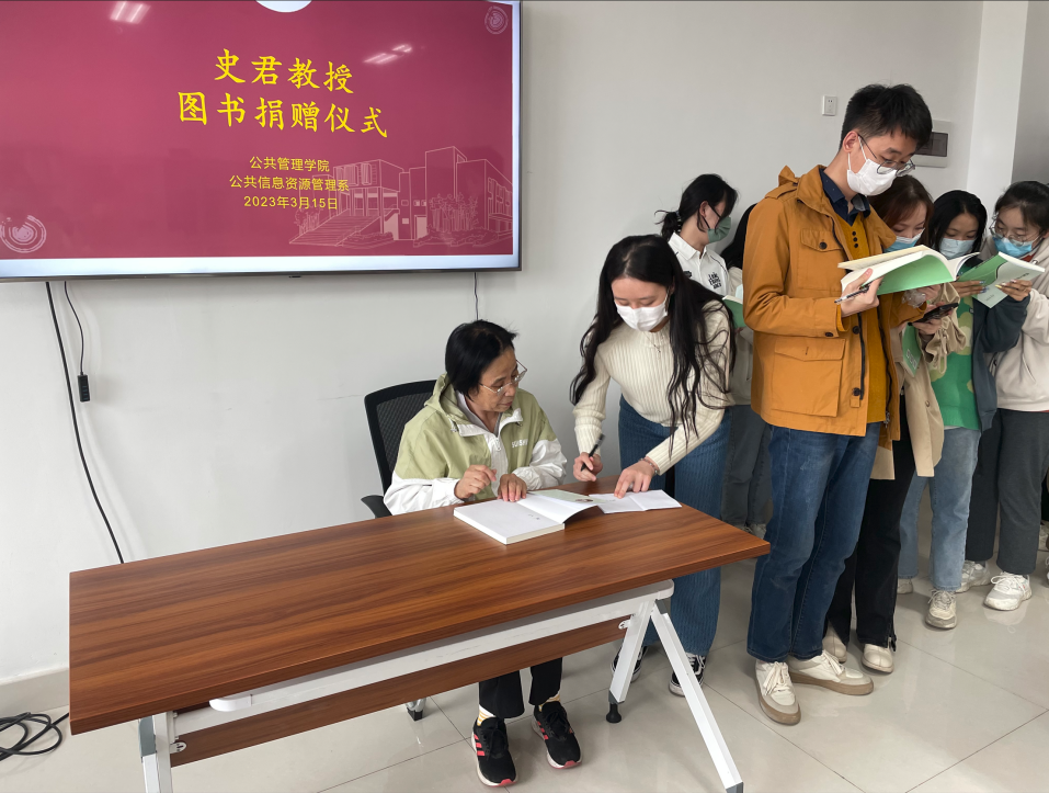 接着,史君教授为与会师生签名和发放图书,并交流宝贵的档案工作经验。她认为“档案”两字重千斤,档案工作是一项神圣并造福后代的事业,并用自己数十载如一日的档案工作经历与感悟感召大家,还以毕业生派遣等生动例子为学生们讲解兰台人的重要价值。史君教授寄语档案学子在清贫中寻找快乐、在枯燥中寻找前进。