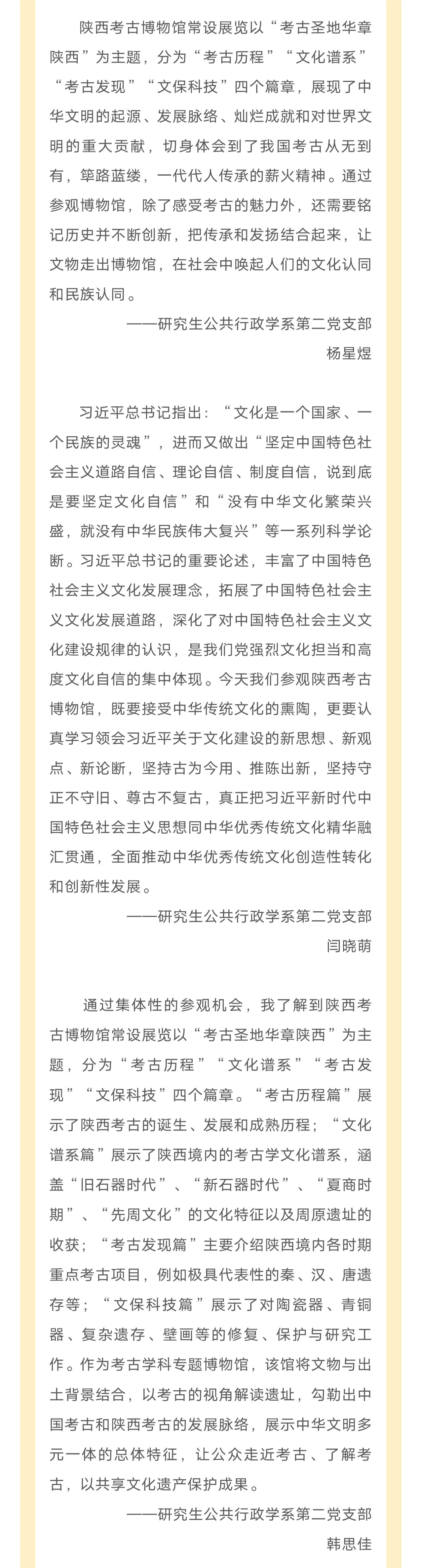 为深入学习宣传党的二十大精神,贯彻习近平总书记对宣传思想文化工作作出的重要指示,围绕在新的历史起点上继续推动文化繁荣、建设文化强国、建设中华民族现代文明这一新的文化使命,研究生公共行政学系第二党支部开展“用习近平文化思想凝魂聚力——参观陕西考古博物馆”主题党日活动,组织党员和入党积极分子参观陕西考古博物馆,深入学习和了解中国历史文化和文明成就,坚定文化自信,昂扬精神面貌,进一步提高党员的政治觉悟和党性修养。