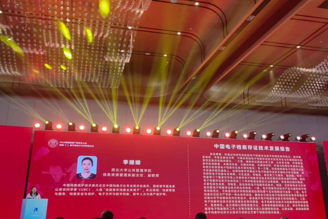 15日下午,在大会闭幕式上,由中国人民大学电子文件管理研究中心协同16位全国档案青年学者完成的《数字中国战略背景下的档案数字化转型年度报告》蓝皮书发布,16个分项报告涉及全国档案各领域各方面数字化转型调研情况及分析结果。我院李姗姗副教授负责其中《中国电子档案存证技术发展报告》的撰写与推出,该报告持续性追踪电子档案存证技术的理论研究焦点、技术研发现状以及施展发展动态,为推动我国电子档案存证技术形成内生与外驱相结合的良性发展态势提供了路径与建议。
