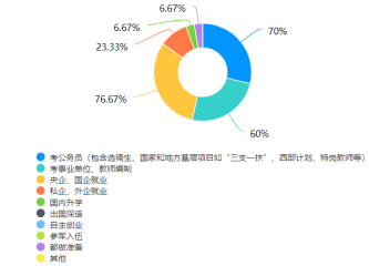在个人未来发展规划上,较多新生(62.5%)有明确计划,且多数学生(76.67%)就业偏向于央企国企就业,考公(70%)和考编(60%)的同学次之,少数人选择在私企就业(23.33%),6.67%的同学计划在国内升学,继续攻读博士学位。