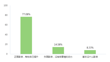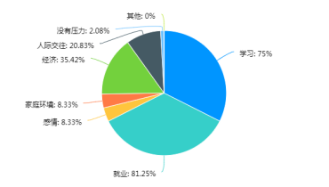 压力是心理健康少不了的话题,根据调研数据,同学们普遍在就业和学习方面感到压力,其中同学们在就业方面压力最大(81.25%),学业压力次之(75%),经济与人际交往分别对35.42%和20.83%的同学造成压力,感情与家庭生活对8.33%的同学造成压力。虽然生活学习中伴随着压力,但大多数同学认为压力对自己有很大的推动作用(77.08%),对于压力的看法有积极的态度。与老师沟通交流或是参与校内活动,提升自己对相关问题的看法,再结合正确的调适方法,其实压力也会变为不懈提升的动力,激励自己不断成长。
