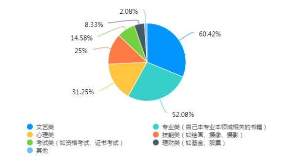 阅读作为放松方式的一种,也很受大家的青睐。在书籍阅读方面,有60.42%的同学最喜欢文艺类书籍,而有52.08%的同学对专业类书籍感兴趣。仅次于前两者的是心理类书籍(31.25%)和技能类书籍(25%),有8.33%的同学倾向于阅读考试类书籍,仅有2.08%的同学偏好理财类书籍。