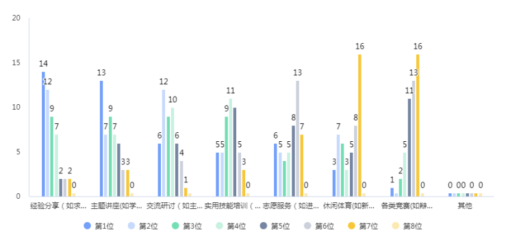 基于对集体活动的看法,同学们较为期待的活动主要是经验分享(求职、就业类活动)、主题讲座(学术、心理类讲座)、交流研讨(主题读书会、导师门诊、文献阅读与管理交流活动),看来同学们现阶段非常重视就业、学业与自我能力提升三方面。当然大家也要注意劳逸结合,期待大家可以在活动中丰富自我,进步成长。