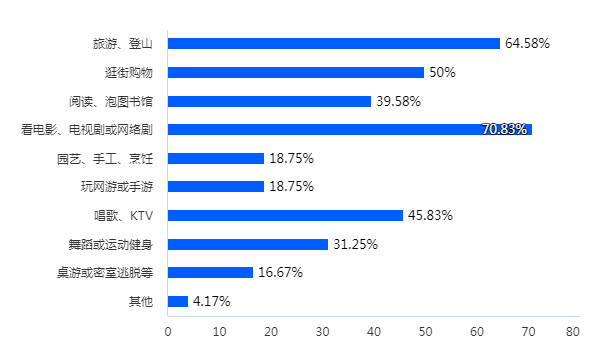 在休闲方式的选择上,看电影、电视剧或网络剧是最受大家青睐的方式(70.83%),有半数的同学选择去旅游或去登山(64.58%)、逛街购物(50%)、唱歌(45.83%)以做休憩。