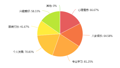 在宿舍生活方面,绝大多数同学能与舍友相处非常融洽,大家常聊的话题分别是专业学习相关(81.25%)、个人发展方面(70.83%)、心理情感(66.67%)八卦娱乐(64.58%),而近一半的同学们彼此之间在兴趣爱好(58.33%)和服装打扮(41.67%)上有共同话题,同学们之间互相交流,大家互帮互助,尽显同窗情谊。