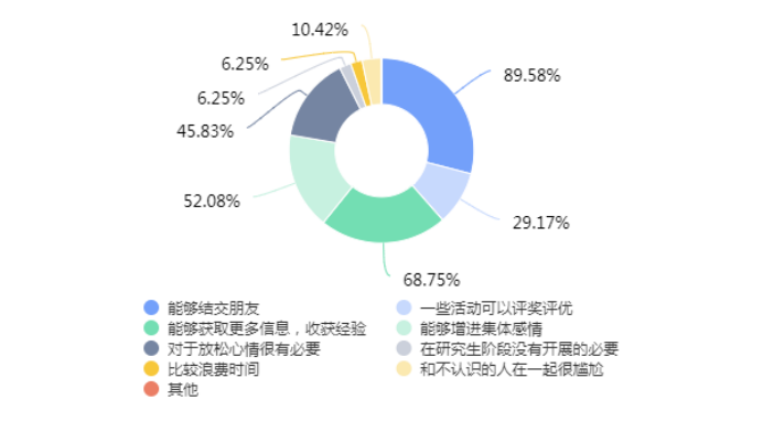 除了学习科研,活动也是研究生生活不可缺少的一部分。从调查数据看,绝大多数同学赞成集体活动会给自己的生活带来积极体验。同学们普遍认为(89.58%)参与集体活动可以帮助自己结交朋友,但是,有部分同学反映新生之间交流少,存在脸盲、名字对不上人的情况。对此,学院也为大家准备了丰富的活动帮助大家破冰,并会在之后进一步举办更多丰富的活动促进同学之间的关系。