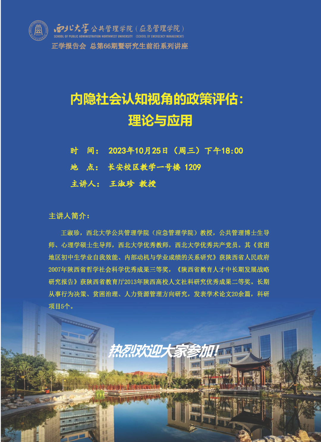 2023年10月25日晚,西北大学565net必赢王淑珍教授在长安校区教学一号楼1209教室为我院2023级全体硕士研究生作了题为“内隐社会认知视角的政策评估:理论与应用”的专题讲座。