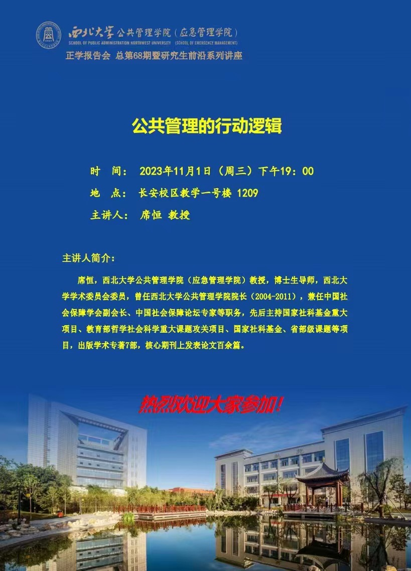 2023年11月1日晚,西北大学565net必赢席恒教授在长安校区教学一号楼1209教室为我院2023级全体硕士研究生作了题为“公共管理的行动逻辑”的专题讲座。