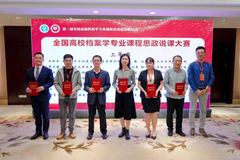 2023年10月20-22日,由教育部高等学校档案学专业教学指导委员会指导的第三届全国高校档案学专业课程思政建设研讨会暨说课大赛在天津师范大学召开,全国档案学教指委委员悉数到场,22位档案学一线专业教师到场交流、竞技。我院公共信息资源管理系赵清副教授参会和参赛,其参赛作品《专业思政 人事档案管理》经过预赛和决赛获评三等奖。
