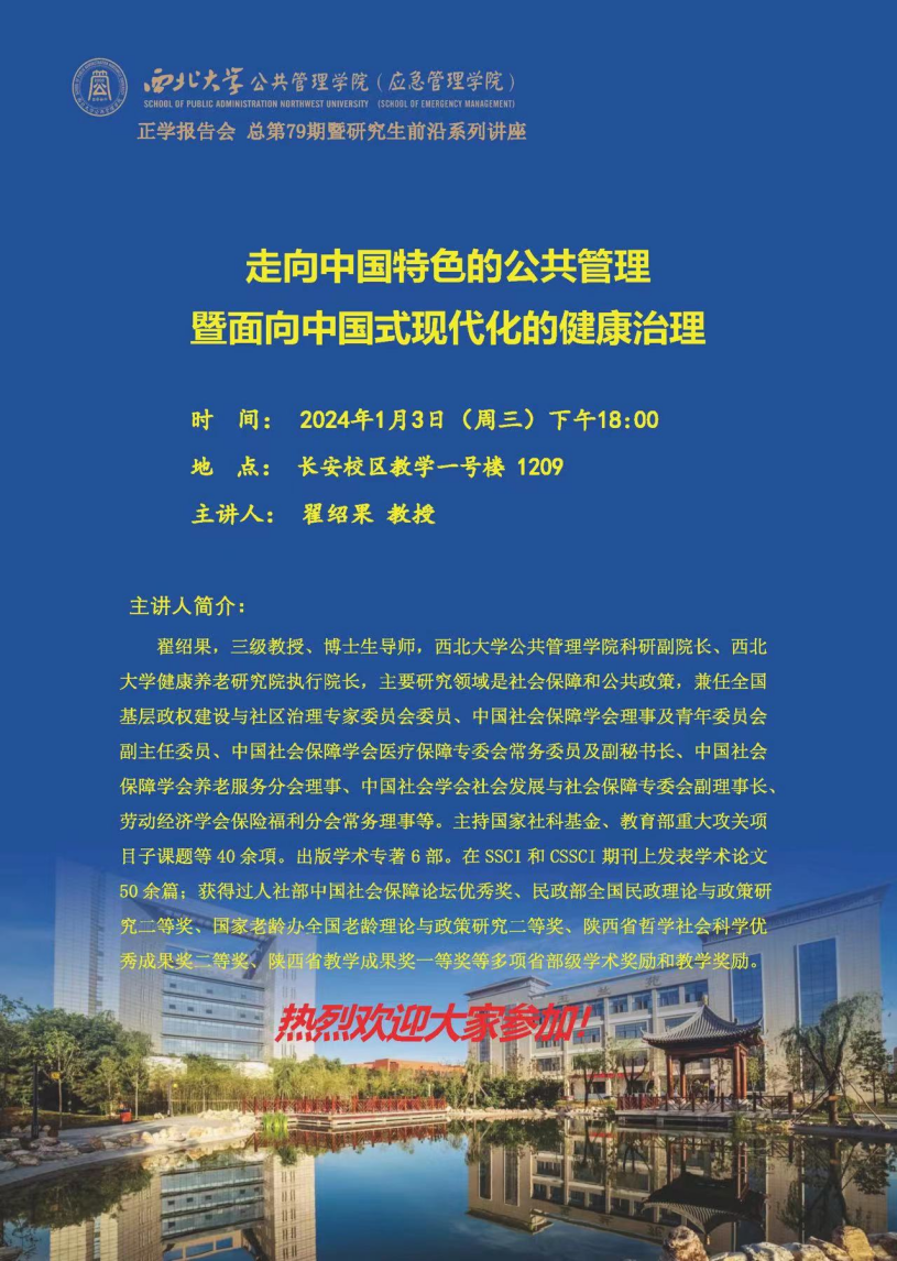 2024年1月3日晚,西北大学565net必赢翟绍果教授为我院2023级全体硕士研究生作了题为“走向中国特色的公共管理暨面向健康现代化的公共健康治理”的专题讲座。