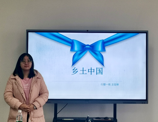 2023级行政管理专业硕士研究生王佳坤的汇报书目是费孝通的《乡土中国》,她从作者简介、本书主要内容、城乡中国的现代转型以及个人感悟进行介绍。她首先将本书分为乡土社会基本特征和乡土社会的现代化转型对本书内容进行简要介绍。紧接着,她对本书内容进行延伸,从中国古代乡村治理和现代中国城乡治理的角度进行阐述。最后,她对本书特色进行总结并分享了个人感悟。