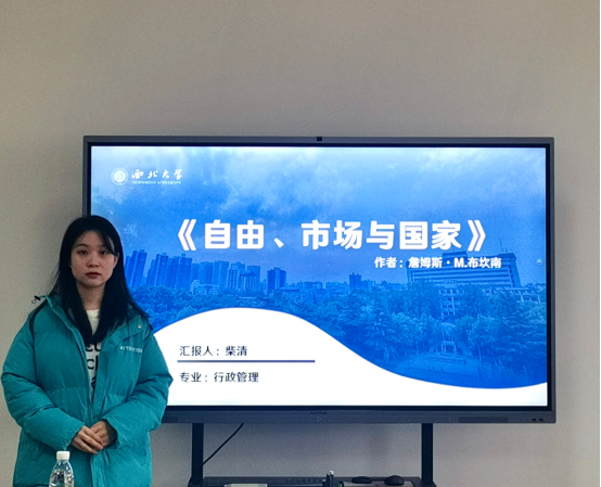 2022级行政管理专业硕士研究生柴清分享的书目是詹姆斯·M·布坎南的《自由、市场与国家》,她从作者简介、写作背景、逻辑框架与内容、核心观点、思考与启示这五个方面进行分享。首先,她分析了本书的逻辑结构,在此基础上阐述了本书作者的核心观点。接着,她提出了本书所涉及到的基本问题,包括秩序、自由、正义、效率、交换等,并阐述了本书撰写的内在逻辑。最后,她对本书进行了总结和反思,并提出本书带来的关于正确处理政府和市场关系的启示。