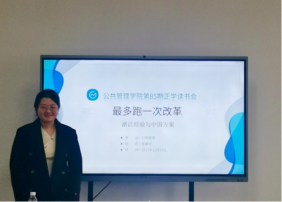 汇报结束后,王若莹博士对其汇报内容做出点评。她认为陈秦钦同学的汇报内容丰富,对浙江“最多跑一次改革”进行了深入分析。汇报内容特别是政策创新扩散这一部分带给我们很大启发。此外,王若莹博士谈到,该书对“最多跑一次”改革的研究全面透彻、深入系统,为我们理解这场“以人民为中心”的公共管理改革提供了有益的文本。