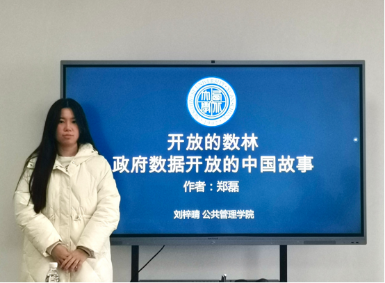 2023级行政管理专业硕士研究生刘梓晴分享的书籍是郑磊的《开放的数林 政府数据开放的中国故事》,她从本书作者及书籍简介、书籍目录、核心概念、数据开放的中国道路与小结五个方面展开汇报。刘梓晴同学首先对该书的基本概况和作者做了简单的描述,并介绍了本书研究的主要问题。紧接着,她简述了全书八个章节的主要内容,介绍了真假数据开放的概念,提出数据开放应遵循的八项基本原则,并基于上海、贵阳、杭州和德州四个地方政府数据开放的实际案例分析了中国数据开放的现状、优点与未来。最后,她介绍了政府数据开放的评估内容、方法与原则,并基于对本书的理解与中国,向大家分享了自己的阅读感悟,认为中国数据开放工作在近年来取得了较大成就,应该保持这种发展趋势,增加组织重视度,实现数字政府建设的全面发展。