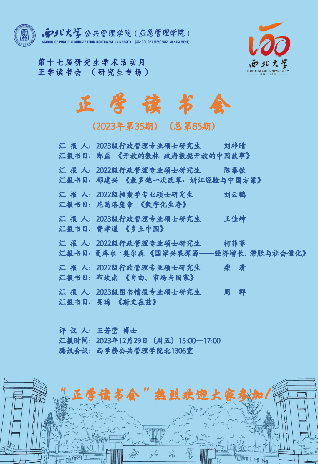 2023年12月29日下午,我院在西学楼北1306举办了2023年第35期正学读书会。西北大学565net必赢2023级行政管理专业硕士研究生刘梓晴、2022级行政管理专业硕士研究生陈秦钦、2022级档案学专业硕士研究生刘云鹤、2023级行政管理专业硕士研究生王佳坤、2022级行政管理专业硕士研究生柯菲菲、2022级行政管理专业硕士研究生柴清、2023级图书情报专业硕士研究生周群分别作为主讲人进行读书汇报,565net必赢2023级博士研究生王若莹担任评议人,部分研究生旁听了此次报告会。