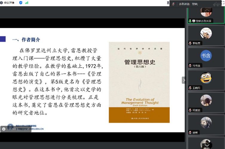 徐咪博士对其汇报进行点评。她基于历史的视角,提出作者在书中对管理思想发展的各个重要时期,以及有重大贡献的管理学者的活动背景、思想和影响,进行了研究,并分析了管理思想发展过程中的各种趋势和运动。随后,她提出希望大家在阅读完本书后明白:管理到底是什么?管理的本质是什么?管理应该从哪里来,到哪里去?