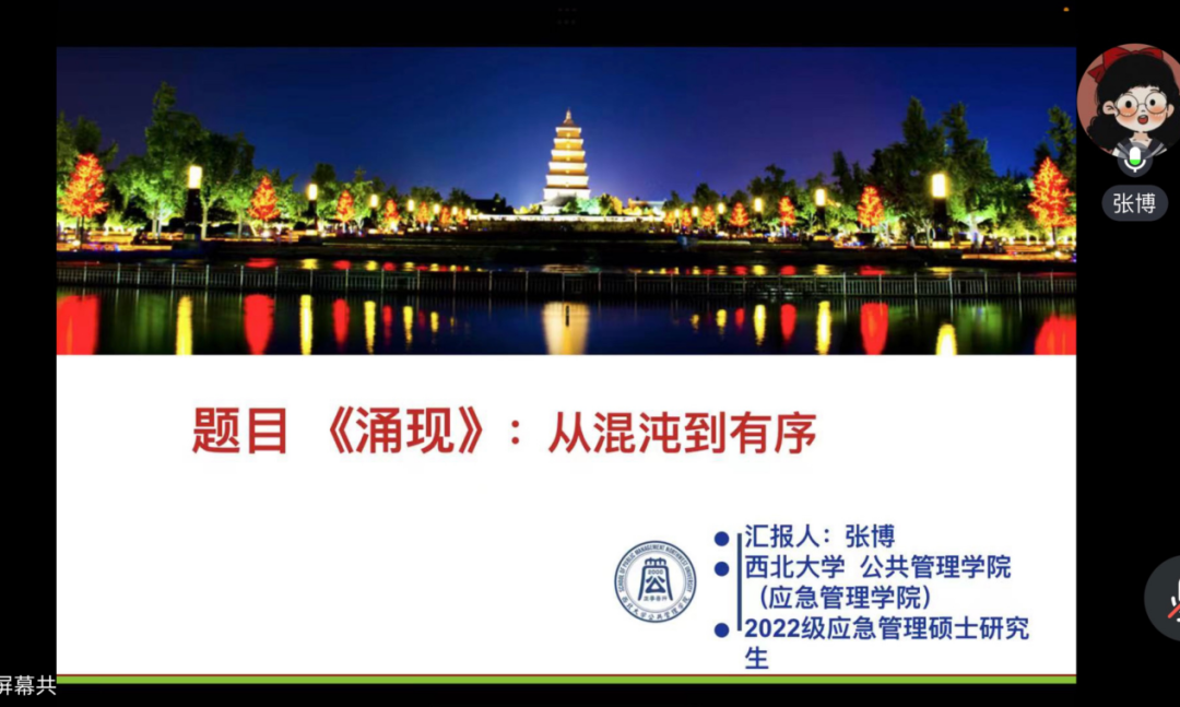 2022级应急管理专业硕士研究生张博分享的书籍是霍兰德的《涌现》。她从作者简介、推荐理由、书籍核心要点梳理和读后启示四个方面进行汇报。首先,她详细介绍了书籍创作背景和推荐该书的理由。紧接着,她陈述了书籍核心内容,生动地阐明了哪些是涌现现象、涌现的特点、涌现产生的条件、涌现理论在日常的应用。最后,通过对涌现概念的梳理,她提出了自己在阅读中产生的困惑和对本书的评价,浅述了自己的启示和收获。