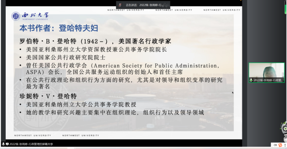 2022级行政管理专业硕士研究生张雨婷分享的书目是罗伯特·B·登哈特和珍妮特·V·登哈特夫妇撰写的《新公共服务:服务而不是掌舵》。她的汇报主要分为作者简介、写作背景及结构、主要内容和主要评论四部分。首先,她深入分析了著作背景和基本概况,指出本书写作的目的为综合呼声以及围绕原则而提供新的表达方式,写作主题是促进公共服务的价值和尊严以及重新肯定价值观。其次,她回顾了本书的十个章节的主要内容和观点,以层层展开的形式,介绍了著作的写作思路和行文逻辑,提炼出每个章节的主要内容。最后,她从自身专业对本书的评论进行了述评,列举了《公共行政评论》的主编拉里特里教授、美国公共行政学会会长玛丽以及译者丁煌对于本书的评论,肯定了本书在公共行政领域的重要性。