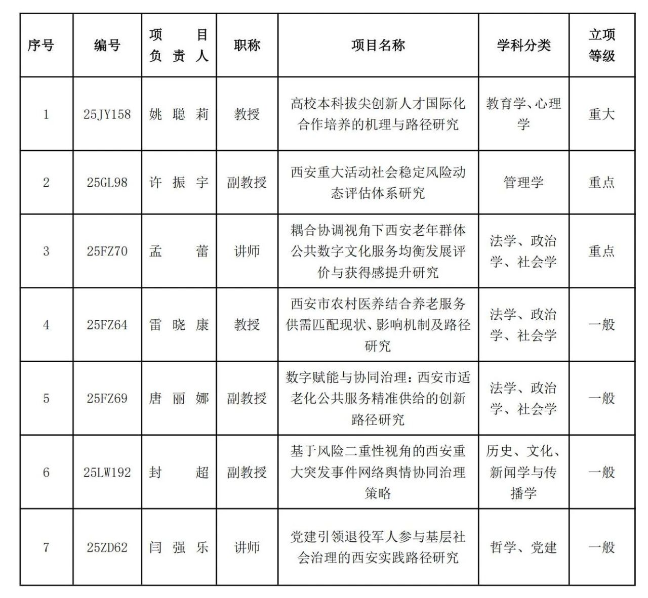 2025年度西安市社会科学规划基金项目立项评审结果