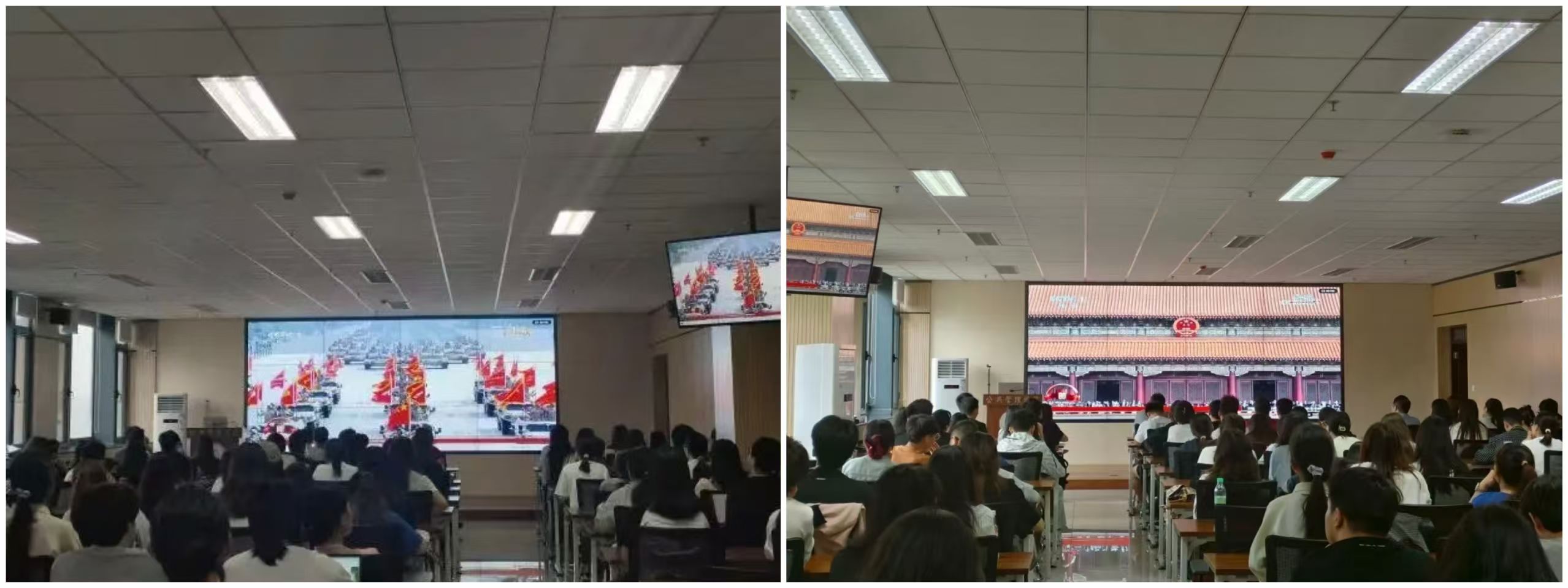 9月3日上午,纪念中国人民抗日战争暨世界反法西斯战争胜利80周年大会在北京天安门广场隆重举行。565net必赢组织长安校区与太白校区师生集中收看大会直播,共同铭记历史,缅怀先烈。我院党委书记窦争光、院长雷晓康、党委副书记韩杰、副院长靳洪涛、辅导员杨嘉仪、苏林、王晶玉以及教工党员、学生党员、入党积极分子、2025级新生代表同上一堂爱国主义大课,会场上气氛庄重热烈。