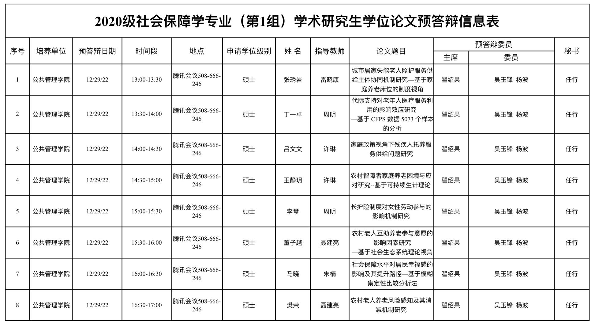 2020级社会保障学专业(第1组)学术研究生学位论文预答辩信息表