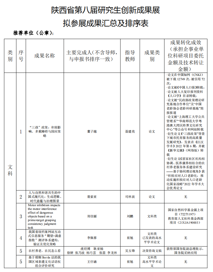 陕西省第八届研究生创新成果展 拟参展成果汇总及排序表