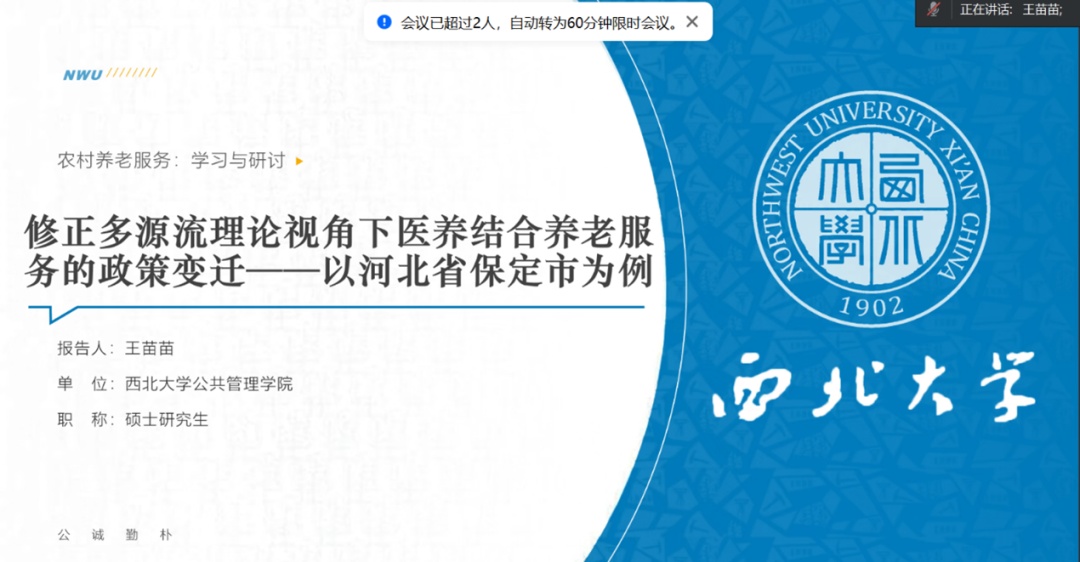 王苗苗同学汇报的题目是《修正多源流理论视角下医养结合养老服务的政策变迁——以河北省保定市为例》,汇报首先介绍了中国人口老龄化程度的加深将为国家和社会带来巨大的挑战,具体来说,主要表现为少子老龄化趋势明显、医疗和养老服务供需失衡等,接着基于多源流理论对其进行本土化修正,认为政治源流具有主导地位、政策企业家的角色转变、三种源流的耦合与互动、政策议程的动态性循环。同时,王苗苗同学进行了保定市医养结合养老服务的多源流分析。认为医养结合养老服务政策变迁的根本动力,医养结合养老服务政策变迁的关键动力,医养结合养老服务政策变迁的核心动力。最后,王苗苗同学对医养结合养老服务发展提出了优化路径,包括甄别问题源流、保证问题输入畅通,厘清政策源流、合理优化备选方案,借力政治源流、营造良好舆论环境,把握政策之窗、合力助推源流耦合。