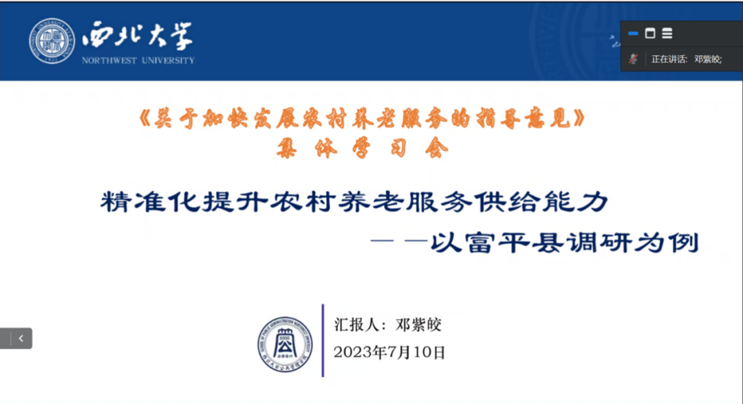 邓紫皎同学汇报的题目为《精准化提升农村养老服务供给能力——以富平县调研为例》。汇报首先介绍了养老服务体系建设发展契机的背景靶向,包括人口结构的迅速老龄化、农村养老服务体系薄弱、顶层设计推动、乡村振兴内在要求。接着围绕结合调研的实际情况对研究现状进行了回顾与影响因素分析,认为当前国内外学者对养老服务需求类型的划分那么可以分为经济保障、医疗保健、生活照料、精神慰藉。最后,邓紫皎同学提出了精准化提升农村养老服务供给能力对策,包括强化养老服务的体系韧性、明确农村养老服务需求的优先次序、完善农村养老服务需求评估与预测机制、增强养老服务的“内生动力”与“外部潜力”。