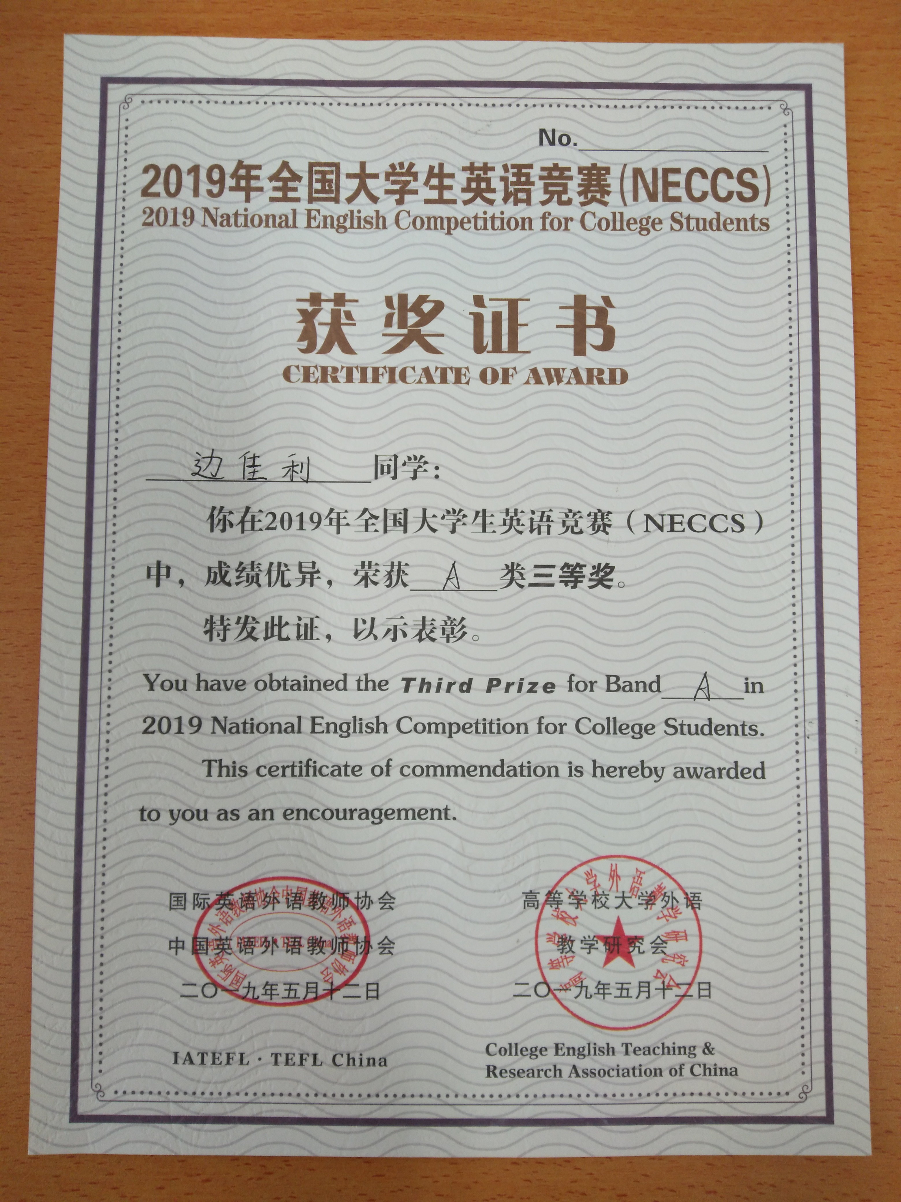 祝贺我院2018级行政管理专业研究生边佳利同学(导师:吴玉锋副教授)荣获2019年全国大学生英语竞赛三等奖。
