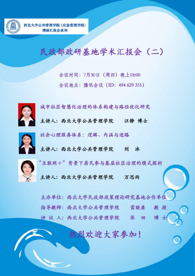 7月30日,我院举办第二期“博硕汇报会系列”——“民政部政研基地学术汇报会”。2020级公共管理专业博士生汪静分享了《城市社区智慧治理的体系构建与路径优化研究》的阶段性研究成果。汇报从城市社区智慧治理的文献梳理、扎根理论分析、模型阐释和优化路径四个方面进行展开。为进一步挖掘城市社区智慧治理体系的核心要素,在对34份文本资料的扎根理论分析基础上,确定城市社区智慧治理体系的场域扩展、平台实践、服务整合和治理优化四个核心要素。在城市社区智慧治理体系构建中,从完善“三体四化”的价值场景、“融合嵌入”的技术平台、“精细便捷”的服务供给、“智慧集中”的治理机制等方面提出城市社区智慧治理的优化路径。2018级行政管理专业硕士生刘冰以《社会心理服务体系:逻辑、内涵与进路》为主题进行了汇报分享,全面梳理了社会心理服务体系的政策发展脉络和社会心理服务体系在满足群众需求、缓解社会矛盾、完善社会治理中的功能定位。进一步,对社会心理服务体系的内涵要义进行了介绍,并区分了心理健康服务和社会心理服务两个概念。在简要总结社会心理服务体系建设试点推进经验的基础上,从理念、运行和保障三个层面分析了当前社会心理服务体系在实践中存在的问题,进而提出了针对性的路径思考。2019级行政管理专业硕士生万思雨分享了《“互联网+”背景下居民参与基层社区治理模式的探析》的学术汇报,该研究构建了网络治理理论框架,在分析行政主导型、居民自治型、社会合作型社区三种典型治理模式中,进一步分析居民自治的参与情况以及参与不足的原因。研究发现,居民参与不足主要体现在制度供给不足、利益相关不足、居民信任不足等方面。在基层社区治理中,从创造良好政策环境、有效协调利益冲突矛盾、健全完善社会公众监督体系等方面,提出解决社区治理中居民参与不足困境的对策建议。