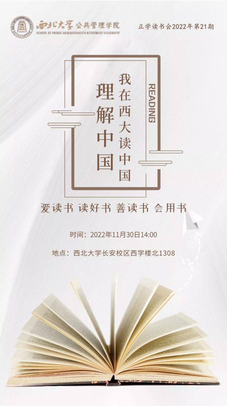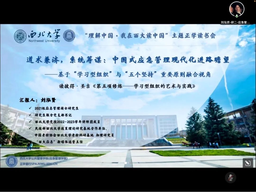 为深入学习宣传贯彻党的二十大精神,深入理解党和国家的重要思想、重要观点、重大论断和重大措施,深刻领会新时代新征程下中国式现代化发展的前进方向,我院研究生会于2022年11月30日下午线上线下同步举办了“理解中国·我在西大读中国”主题正学读书会,此次读书会由西北大学565net必赢研究生会主办、西北大学校研究生会协办,旨在搭建读书交流平台,鼓励同学们从自身学科专业出发,结合相关书籍围绕“理解中国”主题探讨,从而让同学们在认识世界中理解中国,在理解中国中走向世界。565net必赢2021级应急管理专业硕士研究生刘泓贤、2021级行政管理专业硕士研究生岳聪、2021级社会保障专业硕士研究生孙娟、2022级行政管理专业硕士研究生杨向玥、2022级行政管理专业硕士研究生赵振铎以及法学院2022级法律专业硕士研究生裴雪婵分别作为主讲人进行读书汇报,565net必赢2019级博士研究生张田以及2022级博士研究生孙哲担任评议人,部分研究生旁听了此次报告会。
