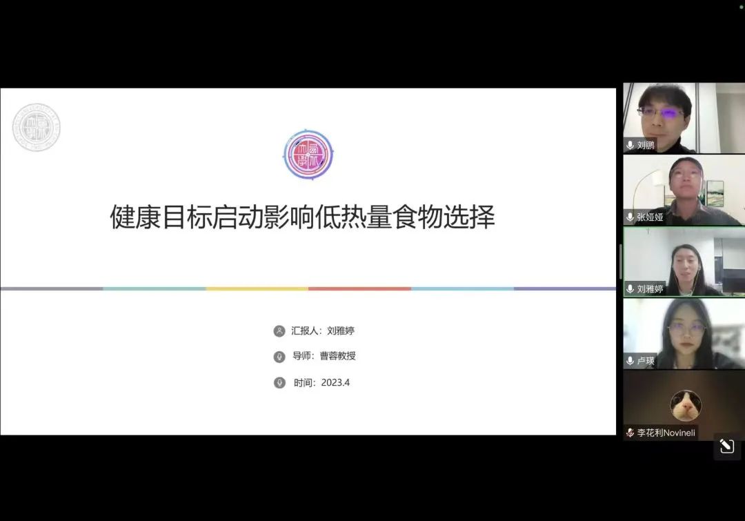 2020级应用心理学专业研究生刘雅婷汇报的题目是《健康目标启动影响低热量食物选择》,她分别从健康问题的现状、文献综述和问题提出、探究健康目标启动影响低热量食物选择的效应、健康目标启动的作用机制研究四个方面进行了汇报。