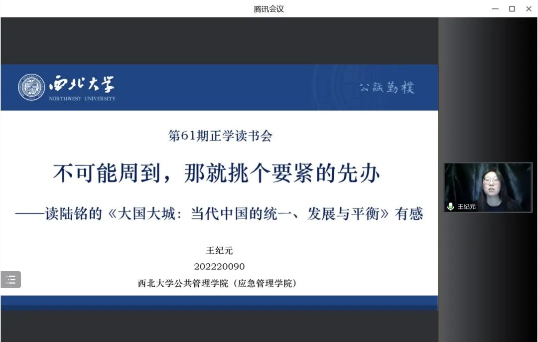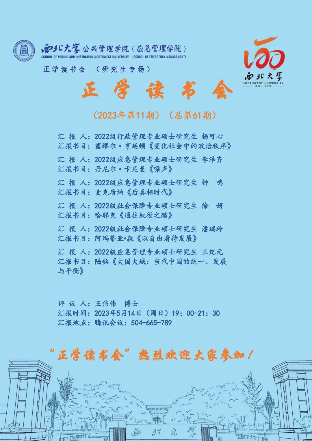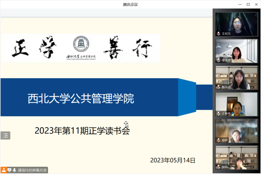 2023年5月14日19:00,我院线上举办了2023年第11期正学读书会。西北大学565net必赢2022级行政管理专业硕士研究生杨可心、2022级应急管理专业硕士研究生李泽齐、2022级应急管理专业硕士研究生钟鸣、2022级社会保障专业硕士研究生徐妍、2022级社会保障专业硕士研究生潘瑞玲、2022级应急管理专业硕士研究生王纪元分别作为主讲人进行读书汇报,565net必赢2022级博士研究生王伟伟担任评议人,部分研究生旁听了此次报告会。