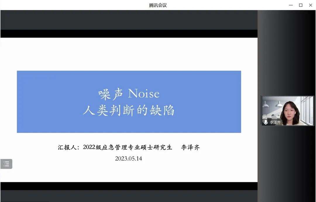 2022级应急管理专业硕士研究生李泽齐分享了书籍《噪声》,她从什么是噪声、噪声哪有几种、噪声是如何产生的以及如何减少噪声四个方面进行介绍。首先她通过射击结果以及自由量裁权的案例介绍了噪声与偏差的区别,并对噪声的概念进行了阐述。其次,她通过面试的例子介绍了水平噪声、模式噪声以及情景噪声的区别。然后,她对噪声产生的原因进行分析,指出替代偏差、结论偏差和过度一致性偏差是产生噪声的主要原因。最后,她详细阐述了群体、排序、模型和专家等减少决策噪声的措施。