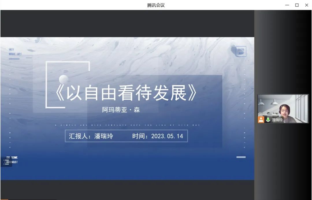 2022级社会保障专业硕士研究生潘瑞玲汇报的书目是阿玛蒂亚•森的《以自由看待发展》。她从作者与著作简介、核心概念、核心关系与理论运用四个部分展开汇报。首先,她介绍了阿玛蒂亚•森的学术经历、主要贡献以及《以自由看待发展》的内容安排。其次,她通过不自由与自由、传统发展观与实质自由发展观的对比介绍了自由与发展的概念。接着,她对自由与发展的关系进行了阐释,包括自由是发展的价值标准、自由是发展的首要目的以及自由是发展的重要手段,并通过案例分析了工具性自由之间的联系。最后,她结合这本书的内容,对饥荒问题、中国农村妇女的贫困问题进行分析,提出对于发展不能只局限于经济指标,还需关注多方面的影响因素,关注可行能力的发展情况,让个人自由成为社会的承诺。