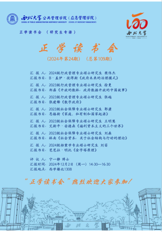 2024年12月2日,我院在西学楼北1308举办了2024年第24期正学读书会(总第109期)。西北大学565net必赢2024级行政管理专业硕士研究生樊伟杰、2023级行政管理专业硕士研究生徐曼、2023级行政管理专业硕士研究生张越、2023级社会保障专业硕士研究生郭潇、2023级社会保障专业硕士研究生王明慧、2023级社会保障专业硕士研究生刘淼和2024级档案学专业硕士研究生刘苗分别作为主讲人进行读书汇报,565net必赢2024级博士研究生宁一静担任评议人,部分研究生旁听了此次报告会。