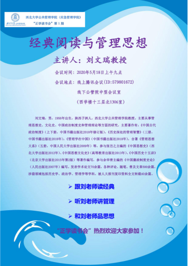 为了进一步营造良好的学术氛围,提高广大研究生的读写思考能力,5月18日上午,我院举办了第一期“正学读书会”。本期主讲人刘文瑞教授围绕“经典阅读与管理思想”主题展开分享与讨论。本次读书会采用线上线下结合的形式,由学院科研副院长翟绍果教授主持,张正军教授、黄新荣教授等多名老师和学生参加了本次会议。