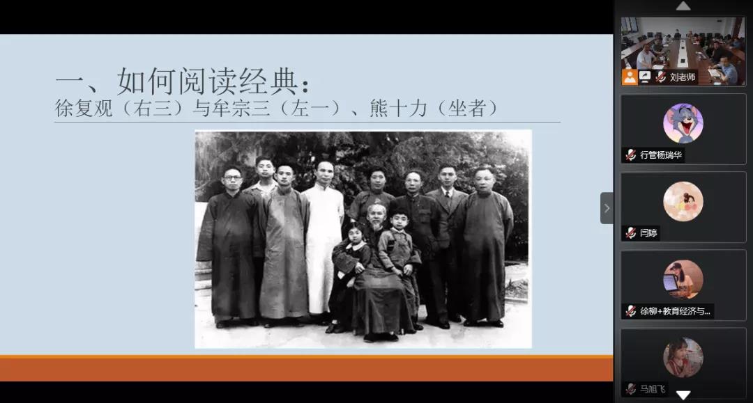 第一部分,在精选细读方面,刘老师引用《论语·为政》中的“学而不思则罔,思而不学则殆”为原则,提出在读书时要做到学思平衡,并以徐复观请教熊十力该读什么书为例指出,读经典不是简单的接受观点,为自己的文章找引文,而是要与作者对话,实现跨时空的共同思考,以作者的终点为自己研究的起点。