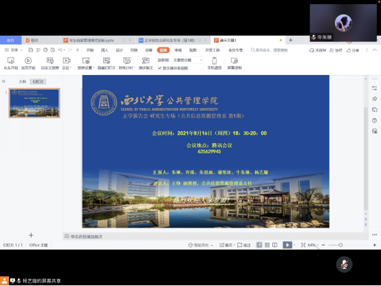 2021年9月16日星期四下午18:30,利用腾讯会议我院公共信息资源管理系举办了正学报告会研究生专场(第一期),这是我院第一次举办正学报告会研究生专场,因此,作为主办团队所在系——公共信息资源管理系非常重视此次活动,全系为此召开了筹办会议,由公共信息资源管理系主任王铮副教授担任这一期的评议老师,图书馆学和档案学专业的学生谢寒冰、杨艺璇、牛朱琳、许琰、朱琳、朱思雨主讲。