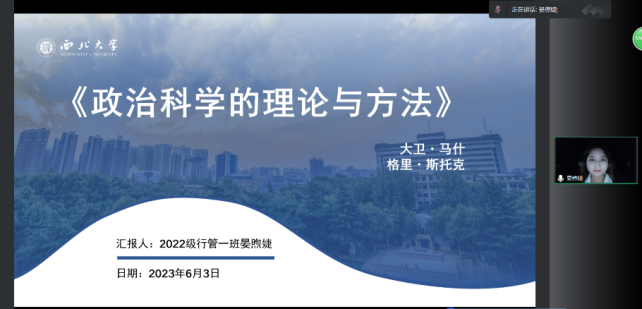 2022级行政管理专业硕士研究生晏煦婕介绍的书目是《政治科学的理论与方法》,她从作者简介、全书结构、内容分享和现实启示四个方面展开了自己的分享。其中在内容分享部分,她对本书第十五章节《实验方法:实验室和田野研究的前景》展开了具体介绍。通过这一章节,她总结了本书的行文逻辑并概括了作者在全书表达的主张,即学者应该打破政治科学中长期存在的偏见,在不同的研究取向之间展开对话与沟通。
