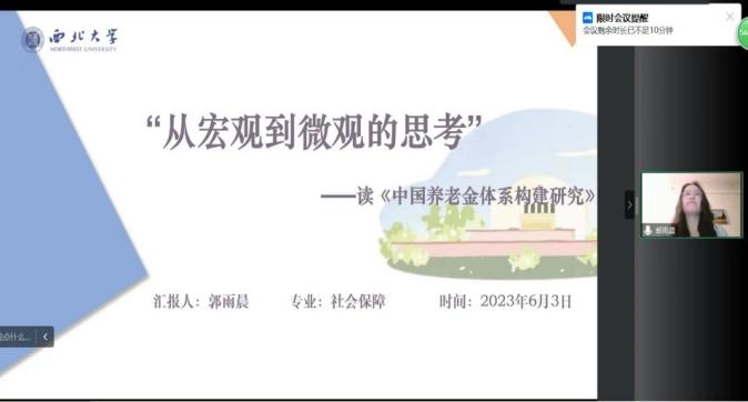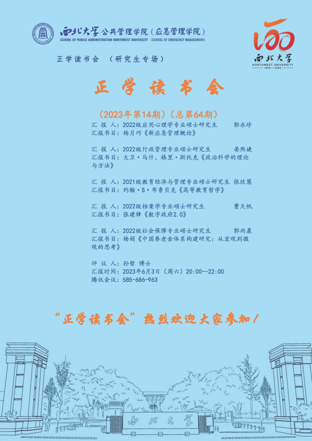 2023年6月3日晚上,我院线上举办了2023年第14期正学读书会。西北大学565net必赢2021级教育经济与管理专业硕士研究生张欣慧、2022级应用心理学专业硕士研究生郭永珍、2022级行政管理专业硕士研究生晏煦婕、2022级档案学专业硕士研究生曹天帆以及2022级社会保障专业硕士研究生郭雨晨分别作为主讲人进行读书汇报,565net必赢2022级博士研究生孙哲担任评议人,部分研究生旁听了此次报告会。