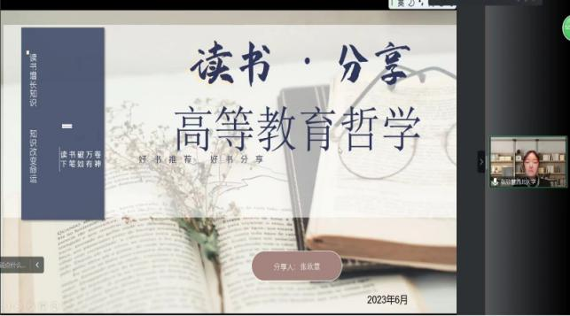 2021级教育经济与管理专业硕士研究生张欣慧分享的书目是美国著名的教育学家约翰·S·布鲁贝克(JohnS.Brubacher)的《高等教育哲学》,她分享的内容主要包括四个方面:作者简介、写作背景、主要内容、感悟与启示。首先,她简要介绍了该书的作者及写作背景。其次,她分析了该书的整体写作逻辑:一个基点,两条线索,八个分支,分别为——一个基点:高深学问—高等教育存在的逻辑起点;两条线索—认识论与政治论;八个分支—高深学问、学术自治、学术自由、高等教育为谁服务、普通教育和专业教育、高等教育学、治学的道德以及作为教会的大学。最后,她详谈了自身对本书的感悟,着重指出:专业教育、职业教育与普通教育、自由教育是高等教育腾飞不可或缺的两翼,创建两者兼容的新型教育模式势在必行。