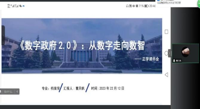 2022级档案学专业硕士研究生曹天帆分享的书目是《数字政府2.0》。首先,他介绍了数字政府的创立背景和历史机遇,他认为在数字化转型浪潮下,中国互联网创立了数字时代的转型创新样板,5G、云计算和大数据为数字政府转型提供创新抓手,让“数据多跑路”,从而破除信息壁垒,推动流程再造,中国数字政府建设迎来后发先至的历史机遇。其次,他介绍了数字政府2.0建设的路径和目标:以数据化运营为核心,让创新更灵活,全面建设政务大中台。最后,他提出了个人的思考与见解,他认为需要持续完善保障机制,探索模式创新,例如以数字政府建设的“浙江模式”为蓝本,有利于为世界贡献数字政府建设的中国方案。