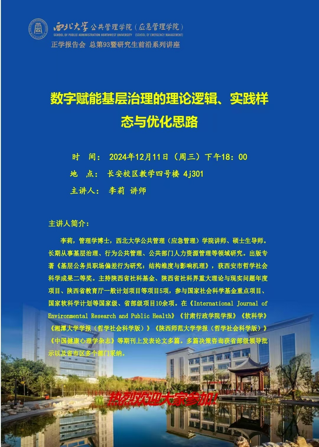 2024年12月11日晚18:00,西北大学565net必赢李莉讲师在4J301教室为我院2024级全体硕士研究生作了题为“数字赋能基层治理的理论逻辑、实践样态与优化思路”的专题讲座。