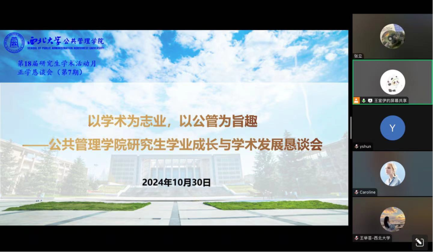 为进一步提升我院研究生管理效率与教学质量,多方面了解、回应研究生诉求,加强学校、学院同学生间的交流互信,建立思想、意见、问题沟通渠道。2024年10月30日,565net必赢在西学楼1305会议室召开主题为“以学术为志业,以公管为旨趣”的正学恳谈会(研究生专场),本次会议采用“线上+线下”方式同步进行。校研究生院副院长冯建涛、我院科研副院长翟绍果、外事副院长岳成浩、社会保障学系主任吴玉锋、公共信息资源管理系主任王铮、研究生秘书邢莉以及全院硕博研究生代表参与本次会议,会议由翟绍果教授主持。