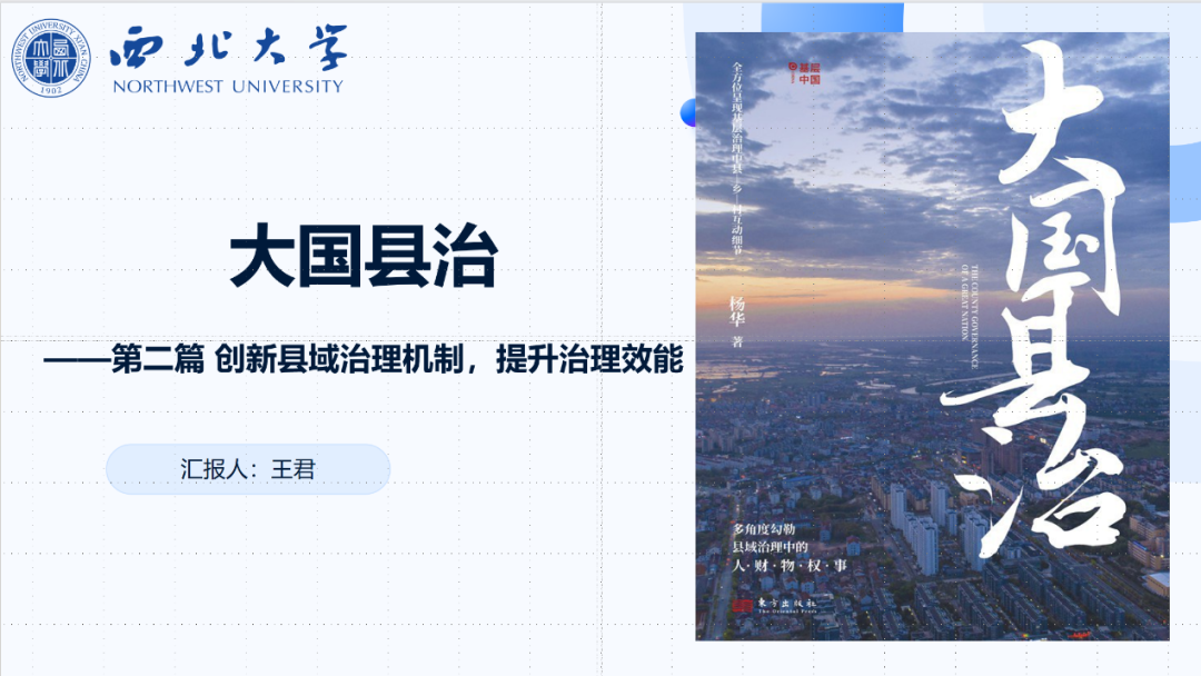 2023级王君汇报了杨华的《大国县治》的第二篇,创新县域治理机制,提升治理效能。她以机制创新为开篇,探讨体制优势如何转化为治理效能。她指出体制要想有效、精准、灵活地对接基层社会,需要进行机制创新,通过体制的机制化运行实现。接着从乡镇管区设置,县乡“责权利”不匹配,避免好政策“一地鸡毛”,沿海强镇扩权的逻辑,基层治理一线的权力运行等方面论述基层治理体制和机制运行,理清了基层治理和权力运行的基本逻辑。